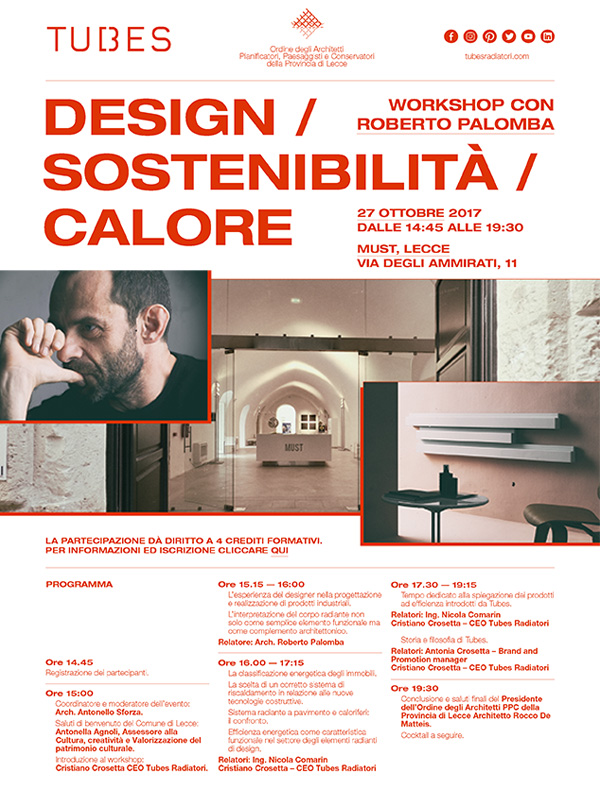 Siamo felici di segnalarvi un evento che si prospetta essere ricco di contenuti e approfondimenti. Si terrà al Must di Lecce l’incontro promosso dall’Ordine degli Architetti della provincia salentina dal tema “Design – Sostenibilità – Calore”. Di sicuro richiamo sarà la presenza di Roberto Palomba, designer di fama internazionale, e di Cristiano Crosetta Amministratore delegato di Tubes Radiatori, che insieme, negli ultimi anni, hanno definito i nuovi standard tecnici ed estetici del radiatore nel mondo del riscaldamento domestico.